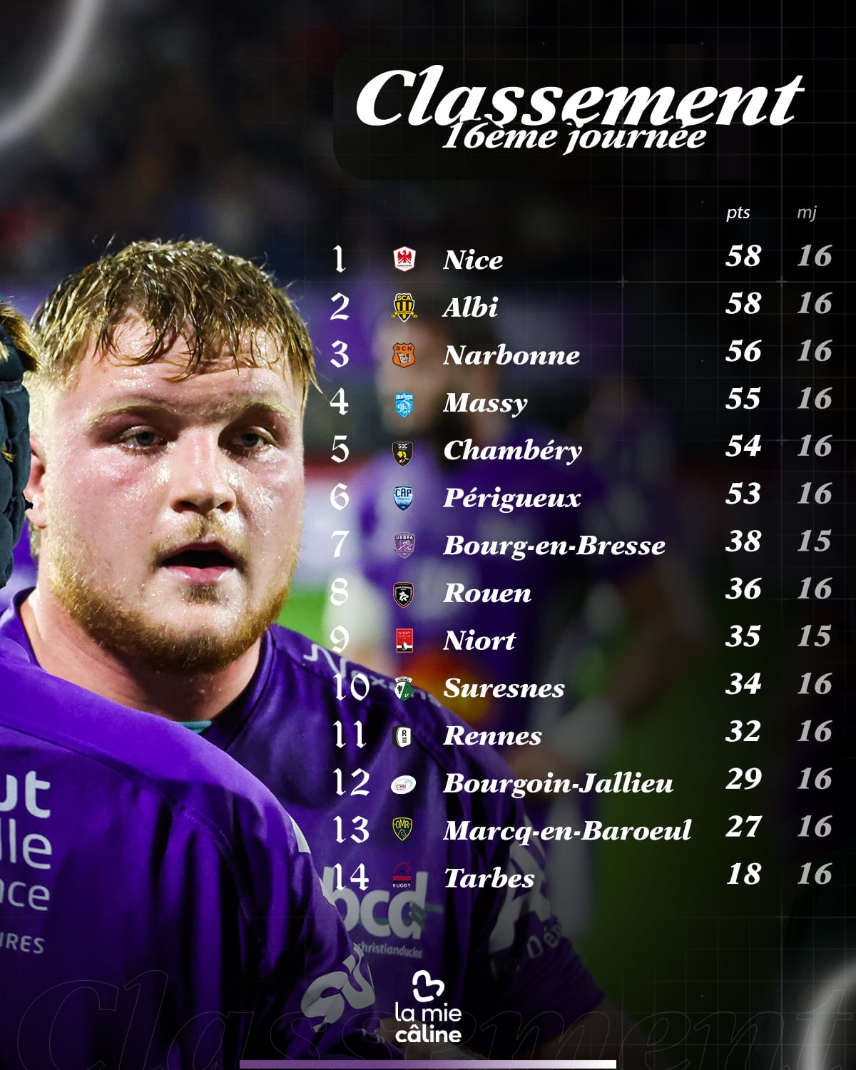 Notre partenaire La Mie Caline vous présente le classement de la Nationale après la seizième journée de championnat. Prochain match : le déplacement à Tarbes le vendredi 23 janvier 19h00 !