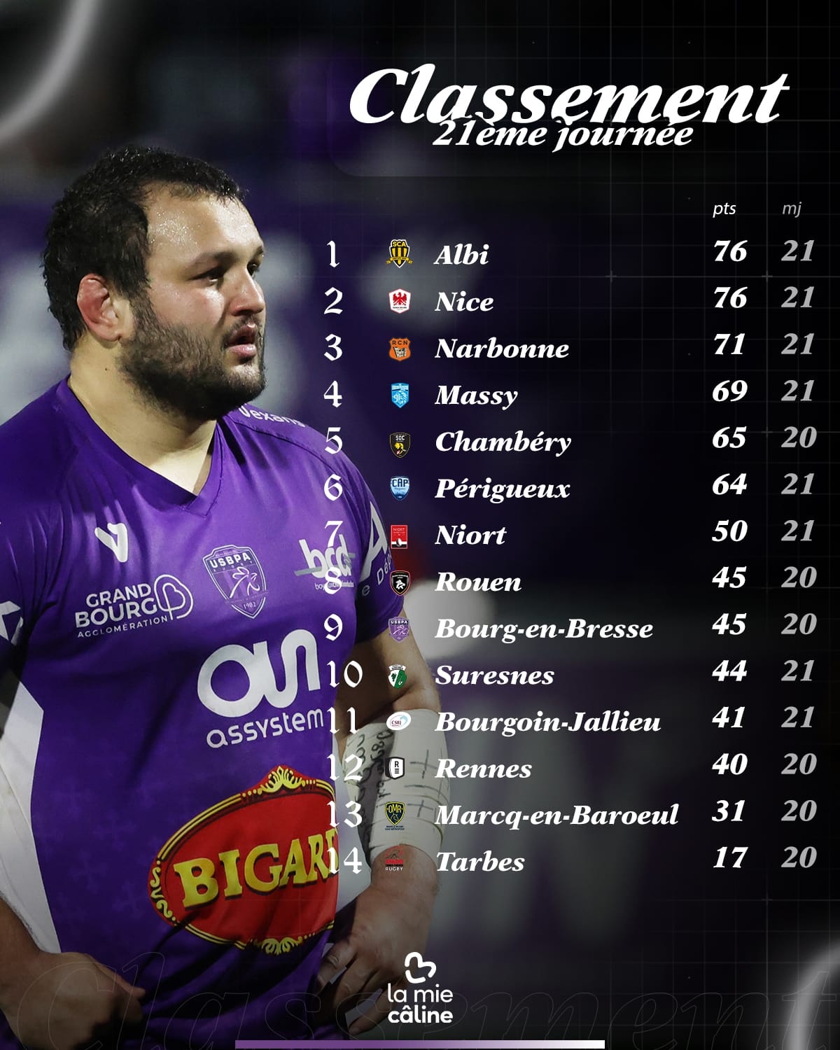 Notre partenaire La Mie Caline vous présente le classement de la Nationale après la Vingt-et-unième journée de championnat. Prochain match : Déplacement à Nice le samedi 7 mars 18h00 !