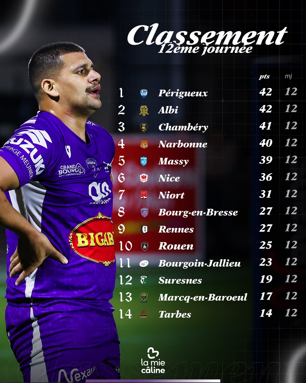 Notre partenaire La Mie Caline vous présente le classement de la Nationale après la douzième journée de championnat. Prochain match : la réception de niort le samedi 6 décembre 15h00 !