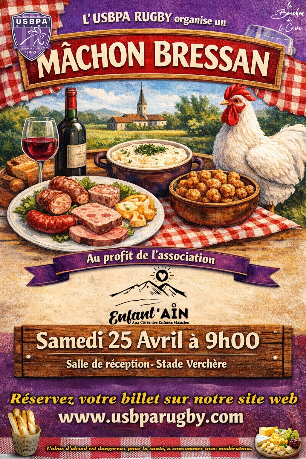 Tradition, convivialité et solidarité au stade Marcel-Verchère de Bourg-en-Bresse le samedi 25 avril 2026 ! L’USBPA Rugby vous donne rendez-vous au mois d’avril pour le 1er Mâchon Bressan qui se tiendra dans l’espace VIP du stade. Au programme :