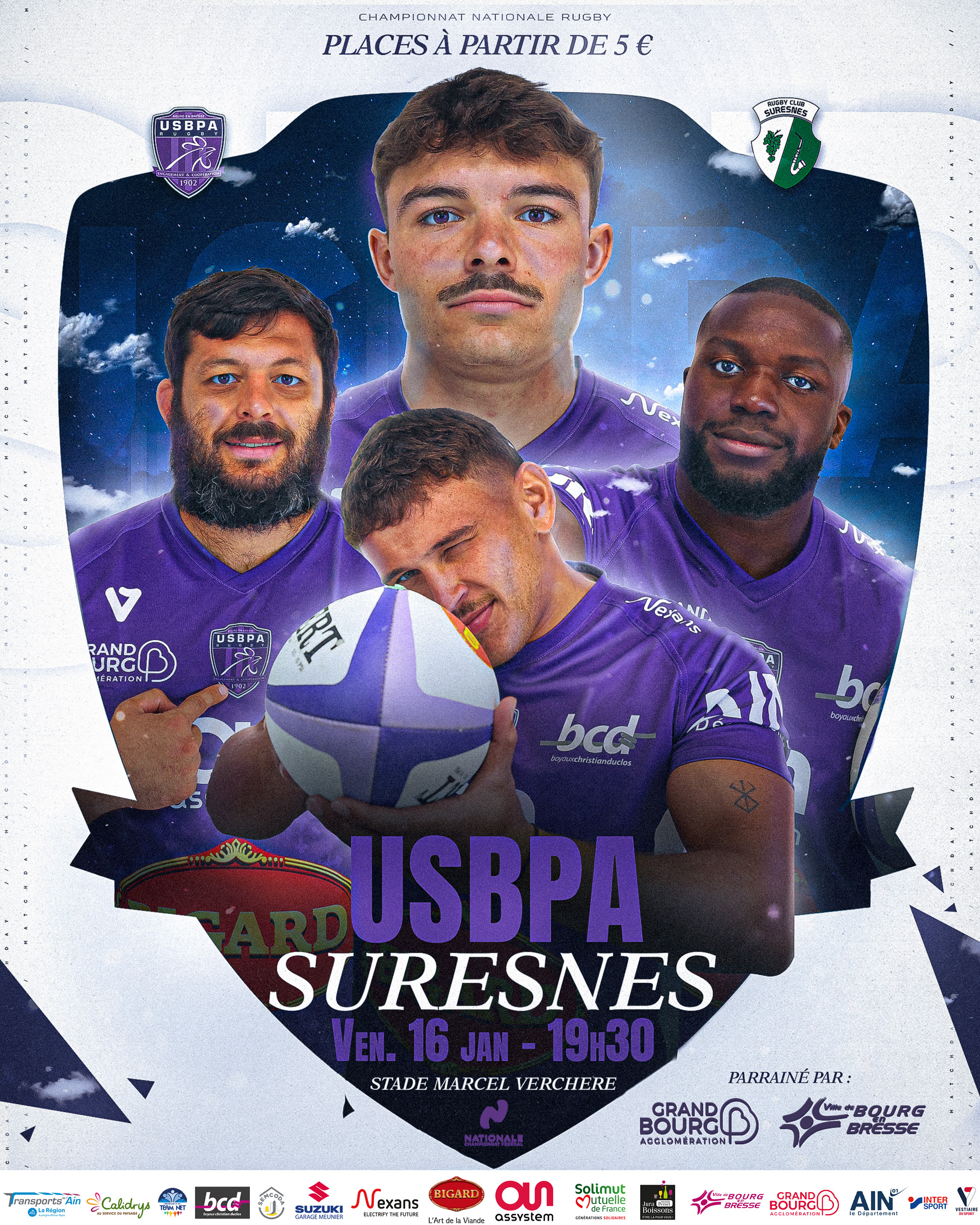 La Ville de Bourg-en-Bresse et Grand Bourg Agglomération sont fières de parrainer cette rencontre entre l’USBPA et Suresnes ce vendredi 16 janvier au stade Marcel Verchère (19h30). Gagner sur les terrains, structurer le sport sur le territoire et investir durablement dans des équipements de qualité : telle est l’ambition portée par nos collectivités. Ville active et sportive, Bourg-en-Bresse s’engage chaque jour aux côtés de 110 associations sportives, de 20 000 licenciés et de 4 clubs évoluant au plus haut niveau, dont l’USBPA. Avec près de 15 millions d’euros consacrés chaque année au sport sur Grand Bourg, ce sont bien plus que des performances qui sont soutenues : c’est toute une dynamique territoriale au service des sportifs et du vivre-ensemble. Bon match à tous et allez les Violets !