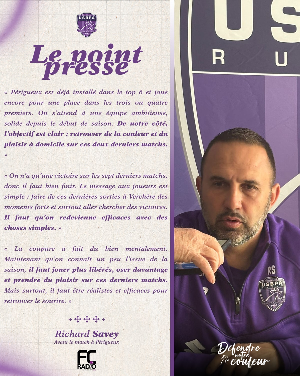 Retrouvez les déclarations de Richard Savey et Mattéo Broeders avant la réception de Périgueux ce vendredi 21 mars à 19h30, avec notre partenaire FC Radio.