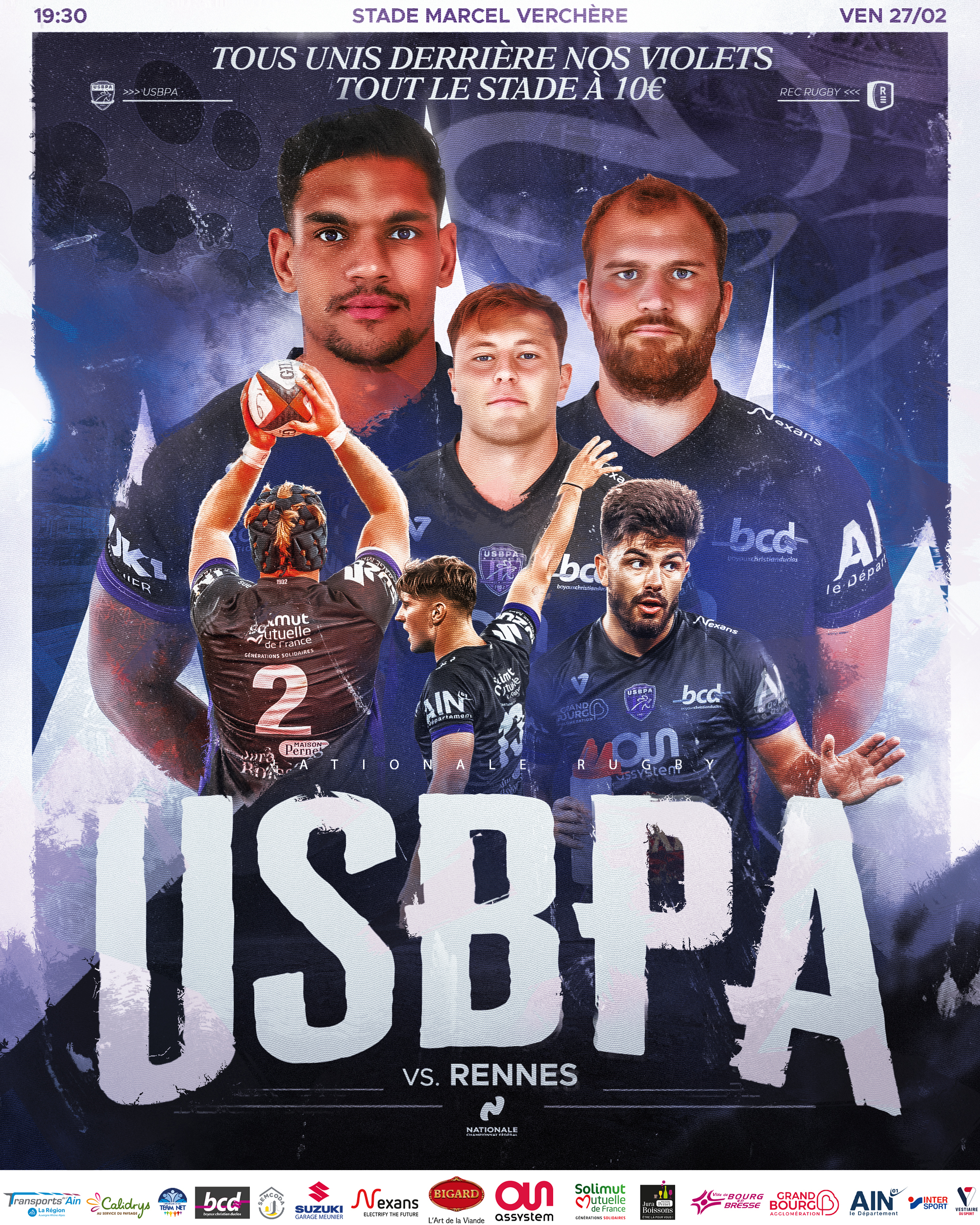 Vendredi 27 février à 19h30 au stade Marcel Verchère, l’USBPA Rugby reçoit Rennes, promu en Nationale cette saison. Nous comptons sur le soutien de toutes et tous, petits et grands, pour endosser le rôle de 16ème homme et venir pousser nos joueurs vers le chemin de la victoire. Car l’aventure sans vous est moins belle, car le Peuple Violet a toujours montré par le passé qu’il était présent dans les bons comme les moins bons moments : tous unis derrière nos Violets ! Tout le stade à 10€ (hors guichets soir du match).
